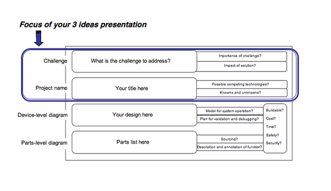You will get questions and immediate feedback on your three ideas from your classmates during the "3 ideas presentation." You will also get some more detailed comments from the instructors and your team's mentor. This presentation is worth 15% of your final grade for the class and you will be assigned one score for your team.
