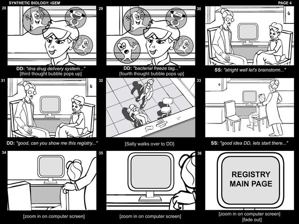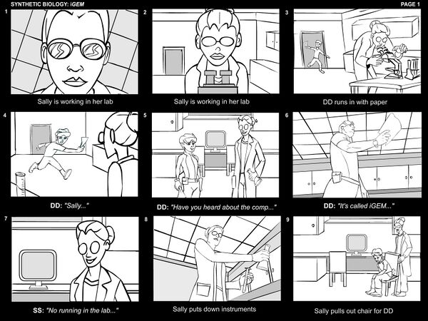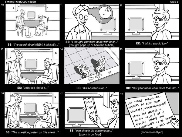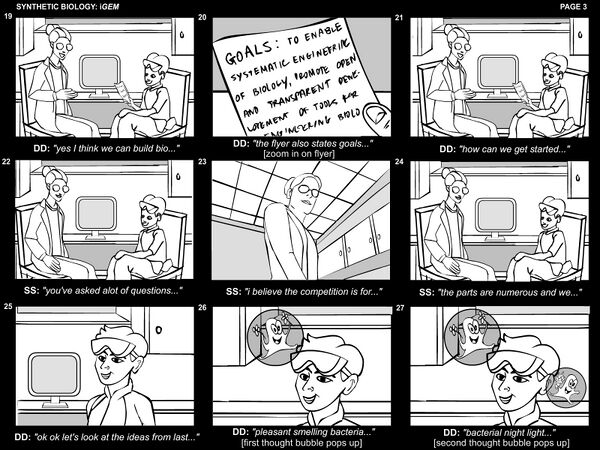 Here are some storyboards from our first animation about iGEM. The script was written by Rebecca Adams, Isadora Deese, Drew Endy and Natalie Kuldell. Storyboarding by the talented folks at Animated Storyboards. Ultimately this and other animations will appear as movies at Biobuilder.org