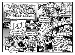 - So, on the plane ride home, I sketched out a version of the comic (Figure 2). You can get a sense of my drawing skills. My hope here was to visually illustrate each of the conceptual sticking points students (and we) encounter in thinking about PoPS, our common signal carrier for genetic devices. That way, we could hand out the comic and folks could see a dialog around each of these sticking points. The comic would provide visual substrate for mulling things over.