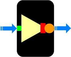 - We (MIT SBWG) had been spending a lot of time thinking about how to hide information and manage complexity in engineered biological systems. One cool set of ideas has developed around engineered genetic devices, and how to send signals between devices using common signal carriers. Unfortunately, it's turned out to be very difficult to teach ideas about common signal carriers to students and others. There are a number of conceptual sticking points. So, to attempt to help with teaching, I made some abstract depictions of genetic devices. For example, here's a depiction of a genetically encoded inverter (Figure 1).
