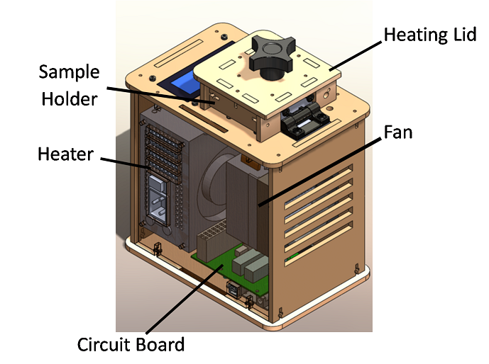 The insides of the PCR machine has a complex of wiring combined with essential components that make the machine work and if there are any faults or misconnections, unreliable data will be loaded and the test will be inaccurate. By unplugging the white wire that connects the circuit board to the heating plate, the LCD displayed an inaccurate temperature reading of -40.0 degrees Celsius. Once the white wire was plugged back into the right connection, the correct reading of 24.4 degrees Celsius was displayed and the temperature monitor was determined to be working properly. Each and every connection within the PCR Machine casing was checked thoroughly to ensure that the device will work the way it was intended. If any of these components, such as the heater, circuit board, fan, or any other critical part of the PCR machine, was not connected properly, inaccurate and false readings would be recorded and the test would be negative. Test Run The initial test run of the device was on October 23, 2013 at 9:51 a.m. The machine was plugged into the school program through the USB port and the OpenPCR software was opened up. Using the software was simple and very straight-forward to use. The machine interfaced flawlessly with the computer software and began testing the device for 35 cycles. A an estimated completion time was displayed of one hour and forty-three minutes. Although this seemed a reasonable estimate, after fifteen minutes of testing, the estimated time read one hour and forty minutes. This was not a very accurate time estimate and after an hour of going through cycles, one hour was still displayed on the computer software. As far as the machine and its performance, it worked as it was intended. Each cycle went through the temperature changes specified and ran according to our specified parameters.