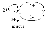 Pseudomonas aeruginosa are bacteria that secrete mucus (alginate) in lungs affected by cystic fibrosis, but not in common environment. As it increases respiratory deficiency, this phenomenon is a major cause of mortality in this disease. The simplified regulatory network, as proposed in [7], contains the protein AlgU (product of algU gene), and an inhibitor complex anti-AlgU (product of muc genes) (see figure 1. on the left: x stands for AlgU, y for anti-AlgU. The mucus production occurs when x=2).