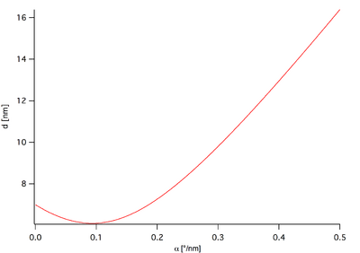 The following diagram shows a relation between [math]\displaystyle{ \Delta\alpha }[/math] and d for R=4nm, D=13nm and [math]\displaystyle{ \alpha_0 }[/math]=0°.