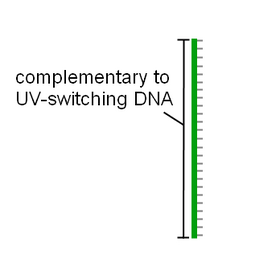 - The UV-switching DNA was used for an anchoring-DNA spot in the light-irradiated gathering mode. The UV-switching DNA forms a stem-loop structure. The loop consists of five bases (TTTTT), and the stem (CT X CT X TC) has two trans-formed azobenzenes (X ). By UV irradiation, the azobenzenes are isomerized from the trans-form to the cis-form. As a result, the stem with the azobenzenes becomes hard to form the double strand [2].