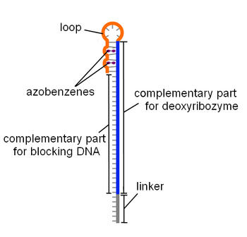 To achieve this switching, it is necessary to design the stem sequence that firmly forms the stem-loop structure at the room temperature but opens the stem-loop structure by isomerization of the two azobenzenes from trans- to cis-form. There are no reports on the opening-and-closing transition of a single molecular by azobenzenes inserted into a stem. Here, we designed the sequences “GAAGAG” and "CT X CT X TC" as the stem and "TTTTT" as the loop by thermodynamic calculations[3]. - The 7th to 37th bases from 5' end (TTTTCACTATTTCGACCGGCTCGGAGAAGAG) is a complementary sequence for the deoxyribozyme (1). In addition, the 7th to 31th bases from 5’ end (TTTTCACTATTTCGACCGGCTCGGA) are a complementary part for blocking DNA (4) below.
