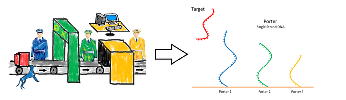 PORTER is in charge of the active transporting of the target into GATE. It is composed of single stranded DNA (ssDNA) sequences. Each ssDNA sequence is called Porter. These Porters are designed to transfer target DNA strands into (or out from) the membrane. <html>