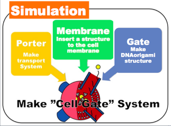 As active transporter, "CELL-GATE" should work in a cell membrane. Thus, a implementation module for inserting it to membranes needs to be designed. DNA sequences with a hydrophobic molecule (cholesterol) are attached outside and around GATE. We use a liposome (artificial lipid vesicle) as a model for the cell membrane.