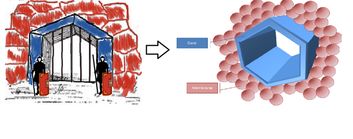 GATE is the gatekeeper that allows only the target to enter the cell. Actually, is cylindrical DNA nanostructure connecting the inside and outside of membrane like a channel. Because GATE is made of DNA origami, electric repulsions caused by the negative charge of the DNA backbone prevent not desired DNA from entering GATE.