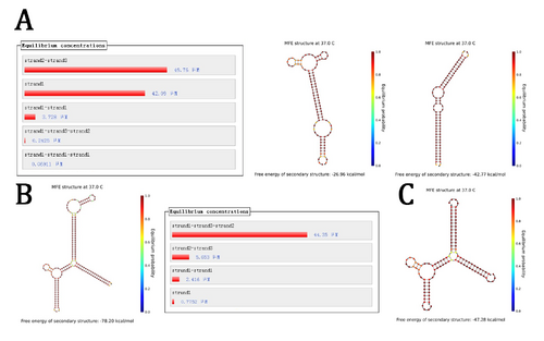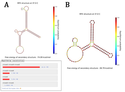 Subsequently, we simulated whether the improved logic gate would form a stable Y-DNA after EcoRI digestion. Again, the result didn’t give us a positive feedback. According to Figure 11., the sequence after digestion would be too short and too close to 8-17’s catalytic core to form a stable duplex. Therefore, we lengthened the sequence to ensure a stable Y-DNA after digestion. The function of this optimized new logic gate were investigated in the wet lab.