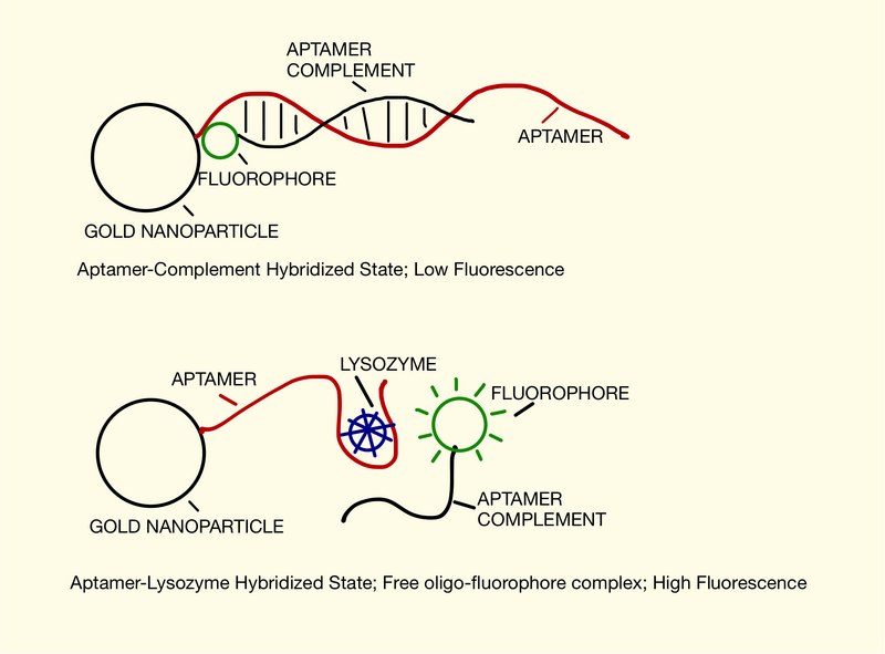 Lysozyme is a naturally occurring protein that can be found in chicken egg as well as in human tears and saliva. The enzyme has antibacterial properties to gram-positive bacteria, which helps ward off bacteria that cause diseases like salmonella. Our device is designed to detect a protein target, i.e. lysozyme, using a DNA aptamer. Upon detection, the complementary strand to the DNA aptamer is released and the flurophore is free to fluoresce. The main reason that we chose to use lysozyme protein over other options is because it is readily availabe for our team to experiment with. We aim to build a multi-aptamer nanoparticle system that can detect viral proteins in the future; however, we first aim to understand the mechanism of a single aptamer device that detects an easily accessible protein. The current application of our device would be to detect the amount of lysozyme in a certain food sample.