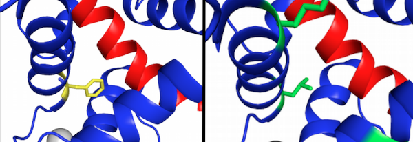 Sequencing of variant H3 revealed 4 mutations to the calmodulin region of the encoding gene. One of these mutations, F19L, altered the large hydrophobic residue phenylalanine to a smaller, still hydrophobic leucine. Residue 19 sits directly in the peptide binding area of calmodulin, indicating that this mutation, and this specific residue, could be very important for determining calmodulin binding specificity.