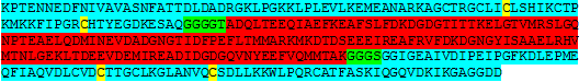 GLucCaM contains ten cysteine residues. Since our protein could not be deactivated with calcium, we considered the possibility of disulfide bonds forming across the protein, preventing conformation changes. Unfortunately, we do not know the specific amino acids responsible for the disulfide bonds, so we selected a reasonable set of four cysteine residues highlighted in yellow below. The light blue indicates the two halves of GLuc, the red indicates calmodulin, and the green regions indicates the two linkers.