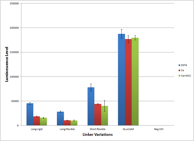 The following graph illustrates the activity of GLucCaM with the substrate coelentarazine measured by the luminescence level. The three conditions are EGTA (which strips away Ca(2+) that might be bound to CaM), Ca(2+), and Ca(2+) with M13. The negative control was expression sample from E.coli that did not contain our expression vector. We can see that the activity of GLucCaM His (His for Hisx6 tag) was substantial higher than negative control and matched the activity of diluted GLuc expression.