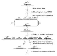 The introduction of specific mutations in a genetic sequence is a powerful way to learn about gene function or to engineer an organism for a desired application. A common way to introduce specific mutations into a target sequence is through allelic exchange. In a typical allelic exchange experiment, the chromosomal sequence to be mutated is synthesized and cloned onto a vector. This sequence is either highly homologous (except for the introduced mutations) to the chromosomal version or else is flanked by homologous sequences specifying the desired insertion site. Upon introduction to the cell, the cell’s homologous recombination machinery will recognize the sites of homology between the vector and the chromosome and at some frequency will stimulate the integration of the vector at the site of homology. This event is often selected for by the presence of a selectable marker present on the vector. Following this selection, it is often desirable to remove the vector to produce a “seemless” insertion. For this purpose, a counterselectable marker is included on the vector. Upon induction of the counterselectable condition, only those cells that have excised the vector sequence through a second recombination event will survive. Since this recombination event is usually rare the counterselection step is essential to find the desired mutants.