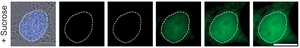 Despite all selections for Spinach being done in vitro, the major utility of a GFP-like system for RNA visualization is in vivo study. Paige et al first expressed Spinach in E. coli under control of a T7 RNA polymerase promoter, providing robust expression. Cells expressing Spinach and incubated with DFHBI show marked fluorescence compared to the control cells. Further, Spinach was fused to the end of a 5S ribosomal RNA expression construct transfected into human cells, and again cells expressing the aptamer and incubated with DFHBI showed fluorescence. This fluorescence could be monitored in real-time, and changes in induction of 5S expression and transport could be monitored under multiple conditions [1].