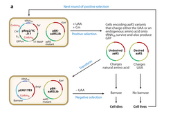 The primary challenge to overcome in the development of these systems is the fulfilling the criteria of aaRS/tRNA orthogonality and aminoacylation specificity. The best starting point for this goal is to import an aaRS/tRNA pair from a different domain of life. The orthogonality of the pair must then be improved by rounds of positive selection to obtain individuals that successfully incorporate the unnatural amino acid of choice and negative rounds of selection to ensure that canonical amino acids are not incorporated at the Amber codon. These rounds of selection typically take place on the tRNA and synthetase individually. This process is diagrammed below.