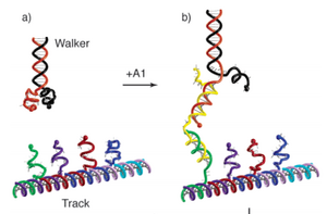 With its more than tenfold higher resolution than that of any previous techniques and its capability to create complex nanostructures from bottom up, we believe DNA Origami can be employed as the molds or platforms with connection sites at its sticky ends for other nano-devices and components. To illuminate, The rigidity of DNA Origami structures together with the stability of their sticky ends can be used to create the platforms on which DNA nanomachine can operate by hoping around sticky ends sites. We strongly believe that in the near future we may be able to construct nano-cities in which nano-motocycles go around and transport molecules to nano-factories. In fact, there have been few initial efforts to realize this vision from Seeman's group, Erik Winfree's group,Hao Yan's group and Pierce's group (Figure 1 and Figure 2).