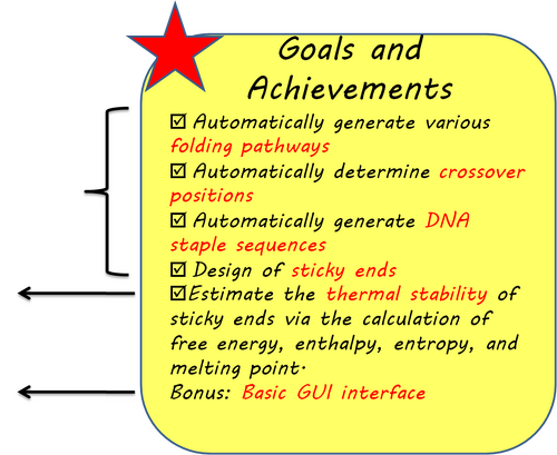 Although DNAmazing has performed well some basic functions of CAD programs, due to the a different approach that we have taken (lithography-like inputting, automatic generation of folding path, automatic generation of staples sequences with sticky ends), there certainly have been some issues related to the initial results and the efficiency of the program.