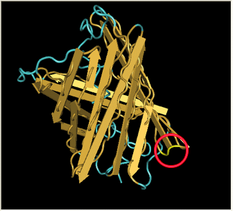 | DsRed - Red Fluorescent Protein | After Acker demonstrated that GFP fluoresces despite a hixC insertion, we tested the same process on RFP, RFP (from Discosoma sp.). Although its DNA sequence is markedly different from GFP's, it has some amino acid similarity and a remarkable structural similarity. Both proteins have a Beta-barrel structure which surrounds an internal chromophore.
