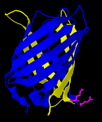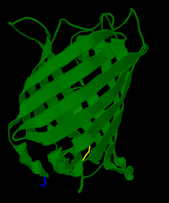 From these 3-dimensional PDB images it becomes apparent that the insertion likely sticks into open space away from the rest of the protein. This increases the likelihood that the addition does not interfere with the beta barrel structure or with the chromophore.