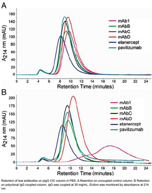 - HPLC retention times of monoclonal antibodies vs solubility (by ultrafiltration). Retention times are inversely related to solubility, with antibodies prone to precipitate at low concentrations in PBS being retained longer on the columns with broader peaks.
