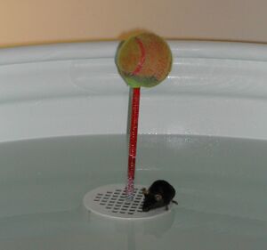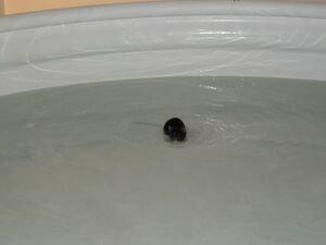 The water maze consists of a metal pool (110 cm diameter) in a well-lit room filled to within 15 cm (???) of the upper edge with water made opaque by the addition of white non-toxic tempera paint. The pool contains a round "escape" platform (11 cm diameter) that the animal can step on to get out of the water. Water temperature is recorded at the beginning of each day of testing and adjusted to within 65-75 degrees F as necessary. After each week of testing, the water maze tank is completely drained and sanitized with Quadracide (2 oz / gal H2O).