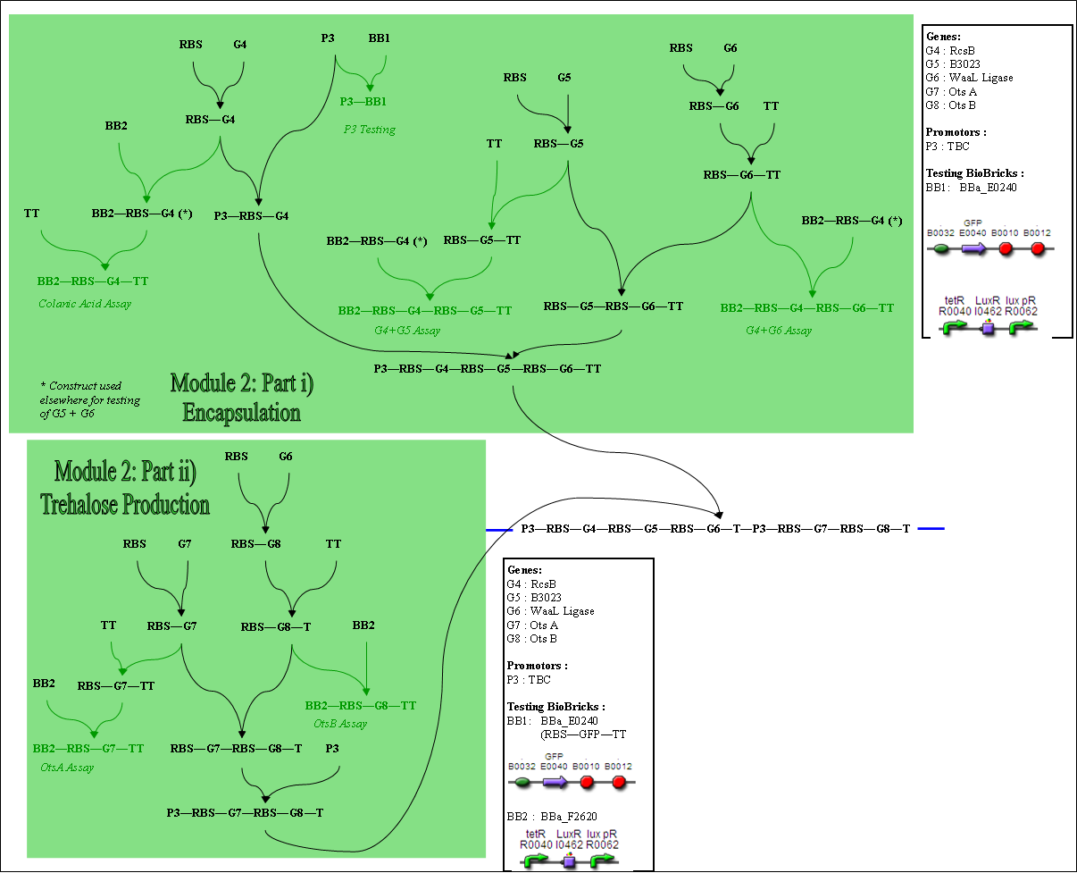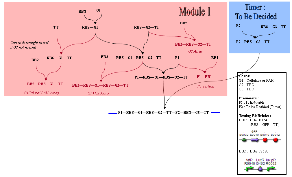 These are including the testing constructs, which are shown in italics. Two standard BioBricks are used for testing - BBa E0240 (BB1) and BBa F2620 (BB2).