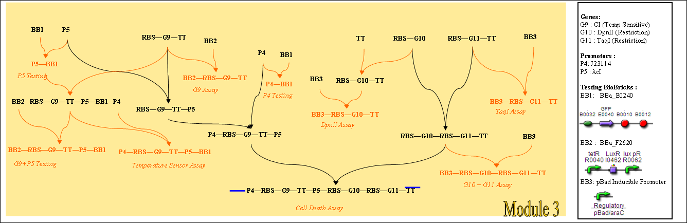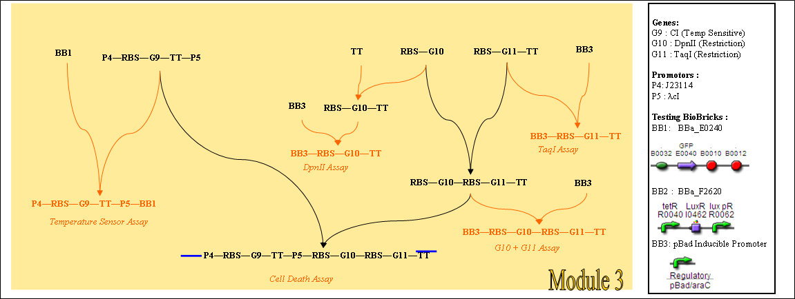 Alternatively, if we can isolate a well characterised temperature sensor BioBrick, several steps can be skipped, giving a cloning strategy as shown below.