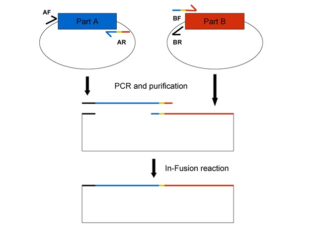 This is a method to assemble two BioBricks using the Clontech In-Fusion PCR Cloning Kit and maintains BioBrick standard formats. There are currently several BioBrick assembly standardsthat all involve assembly by restriction enzyme digestion and ligation. This method describes an alternative assembly method that allows for BioBricks to be assembled via fusion of PCR products. One PCR-amplified BioBrick has homology on each end with the second PCR-amplified BioBrick (vector amplified with the BioBrick) to allow for the fragments to be fused together in the In-Fusion reaction (see figure below). This method can be adapted to fuse more than two BioBricks together and four fragments have been successfully fused. This method can also be used to re-engineer existing BioBricks by using mutagenic primers in the PCR reaction (see the In-Fusion BioBrick Assembly Examples and Detailed Lab Protocols section below for an example of simultaneous promoter and RBS re-engineering).