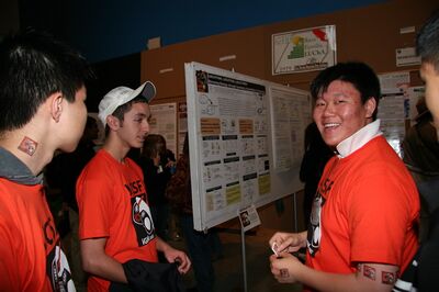 Alex and I stood proudly next to our Poster and we were bombarded with people interested in our project after the presentation. Teams apparently were talking about our 'Synthesome' and were spreading the fact that the UCSF team was composed of Post-High Schoolers. I guess they were mainly interested and drilled us with questions because they wanted to see how well we would measure up without grad schooling, or even undergraduate schooling. I was proud to be acknowledged as a note-worthy contender in a competition filled with graduate students and post-docs from 'name' schools. Alex and I met plenty of people that were really impressed with our project and even tried to get us to go to their graduate schools. I even got interviewed by a press lady. Needless to say, I was very glad I did this project during the summer at this point. Around 7:30pm, poster talk was over, but we still had people flocking to ask questions, so Alex and I basically continued talking and explaining our poster till it was Finalists Announcement time.