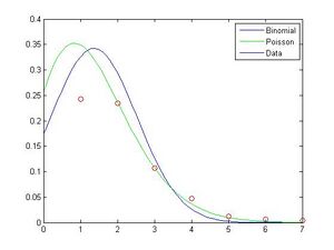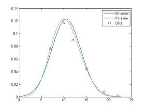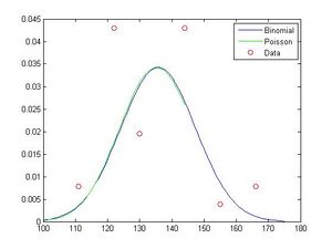with [math]\displaystyle{ a }[/math] = the mean. The Poisson distribution appears only around zero and, unlike the Gaussian or binomial distributions, can only reflect positive integers. You could think of a Gaussian distribution that has been normalized so it can only take on positive values with a mean greater than zero. A place to get comfortable with Poisson distributions can be accessed here 1