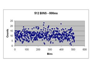 This is Data set 1, where mentioned above we used 512 bins and a time delay of 800ms. For this data set we found a mean value of [math]\displaystyle{ a=10.53 }[/math] and standard deviation of [math]\displaystyle{ \sigma=3.55 }[/math]
