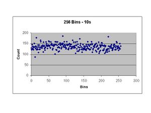 This is Data set 3, where mentioned above we used 256 bins and a time delay of 10s. For this data set we found a mean value of [math]\displaystyle{ a=135.72 }[/math] and standard deviation of [math]\displaystyle{ \sigma=14.25 }[/math]