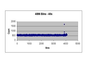 This is Data set 4, where mentioned above we used 4096 bins and a time delay of 40s. For this data set we found a mean value of [math]\displaystyle{ a=543.60 }[/math] and standard deviation of [math]\displaystyle{ \sigma=34.63 }[/math]