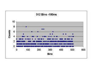 This is Data set 2, where mentioned above we used 512 bins and a time delay of 100ms. For this data set we found a mean value of [math]\displaystyle{ a=1.36 }[/math] and standard deviation of [math]\displaystyle{ \sigma=1.37 }[/math]