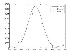 is used. With [math]\displaystyle{ N }[/math] = the number of counts, [math]\displaystyle{ p }[/math] = the probability of counts occurring, and [math]\displaystyle{ q }[/math] = the probability of counts not occurring. In all instances [math]\displaystyle{ p+q=1 }[/math], since something either happens or it doesn't, [math]\displaystyle{ p }[/math] and [math]\displaystyle{ q }[/math] must sum to 1. In context of our experiment, we have a very large [math]\displaystyle{ N }[/math] with a very small [math]\displaystyle{ p }[/math]. Undergoing several manipulations we can approximate the binomial distribution to be the Poisson distribution. Info on the Binomial Dist: here