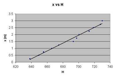 To find [math]\displaystyle{ m }[/math], we simply varied [math]\displaystyle{ x }[/math] and measured the resulting H's. The slope of the line plotted from [math]\displaystyle{ x }[/math] vs. [math]\displaystyle{ H }[/math] gives [math]\displaystyle{ m }[/math]. In doing this, we approximately called the farthest [math]\displaystyle{ x }[/math] as [math]\displaystyle{ x }[/math]=3 meters, and this is not perfect, but we only care about the slope of the plot of [math]\displaystyle{ x }[/math] vs. [math]\displaystyle{ H }[/math], and not the actual values.