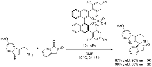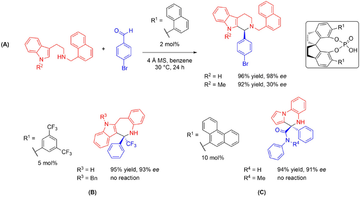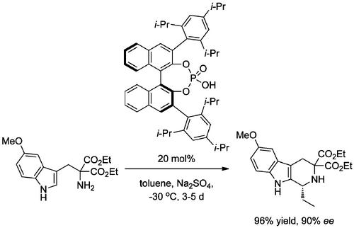 Chiral Brønsted acids have been shown to be effective in the catalytic, asymmetric PS reaction, which builds on earlier work demonstrating the ability of such compounds to catalyze the reaction between nucleophiles and iminium ions.