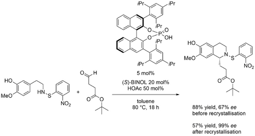 Hiemstra used the enantiomer of (S)-TRIP, (R)-TRIP, as a catalyst in the synthesis of 1-substituted 1,2,3,4-tetrahydroisoquinolines from N-substituted phenylethylamines (Scheme Hiemstra 2014) (10.1021/jo501099h). The phenylethylamine starting material was essentially a dopamine derivative: the 3-hydroxy substituent activates the para-position for ring closure, while the 4-methoxy substituent protects the catechol moiety against air oxidation. The primary amine itself, and N-methyl and N-benzyl phenylethylamines gave inadequate ortho/para regioselectivity and poor enantioselectivity, but N-(o-nitrophenylsulfenyl) phenylethylamines gave very high regioselectivity (less than 5% ortho product) and improved enantioselectivity. It was suggested that this moderately electron-withdrawing substituent prevented catalysis by weakly acidic phenolic OH, and thus increased catalysis by the BINOL-derived phosphoric acid. The enantioselectivity was further increased by adding (S)-BINOL as cocatalyst, and by flowing argon over the solution at 90 °C to azeotropically remove water (other drying agents had a detrimental effect on yield and enantioselectivity). Benzaldehydes with an electron-withdrawing substituent at the para-position performed well. However, p-methoxy benzaldehyde and benzaldehyde itself gave poor enantioselectivities, as did benzaldehydes with substituents at the meta- or ortho-positions. Aliphatic aldehydes performed better, with further improvement upon addition of acetic acid as cocatalyst. The enantiomeric purity of some products was improved by recrystallisation, but yields were reduced significantly due to crystallisation of a racemate. This methodology was used to synthesise a number of natural products and potential drugs.