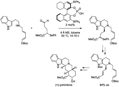 This methodology has been employed in the syntheses of three natural products. The PS reaction used in the synthesis of (-)-arboricine (10.1021/ol900888e) (Scheme Hiemstra 2009) involved an aldehyde containing a dioxolane-protected ketone group. Aminal formation, observed when the ketone was used unprotected, was prevented. It is notable that this protecting group withstands the PS cyclisation, and that the yield and ee of the cyclization were both dramatically improved by its use. The partially saturated (and slightly more sterically crowded) (R)-H8-Binol-PA catalyst was also shown to be effective. This catalyst was subsequently used for the key step in the synthesis of (+)-yohimbine (Scheme Hiemstra 2011).(10.1021/jo201657n). The natural product was to be synthesized via a Diels-Alder precursor that could itself be made using an enantioselective PS reaction. However, the aldehyde required for the PS reaction was β,γ-unsaturated and this was likely to result in the unproductive formation of an enamine from the initially-formed iminium ion. This substrate limitation necessitated use of a latent double bond, in this case a phenylselenide; this group survived the successful PS cyclization and could be eliminated to the double bond via oxidation to the selenoxide. A similar synthetic strategy was employed in the synthesis of the related corynanthe alkaloid family. (10.1002/chem.201103150)