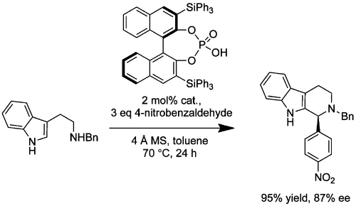An extension to this methodology was developed that allowed the synthesis of enantioenriched N-benzyl-protected versions of similar products from the relevant protected tryptamines and diverse aldehydes (10.1021/jo8010478). During optimization it was found that removal of water was essential for high enantioinduction presumably because water prevents effective association between catalyst and cyclization precursor. Several control reactions were performed under the optimized conditions that suggested this PS reaction was irreversible. The best-performing catalyst was the triphenylsilyl-substituted binaphthyl system, delivering up to 100% conversion and high ee values (78-85%). The ee obtained was sensitive to the aldehyde employed. Of the aliphatic aldehydes, no product was observed with the enolizable phenylacetaldehyde and low ee (8%) was obtained with 3-phenylpropanal. While electron-deficient aromatic aldehydes generally gave products with high ee as expected, there were exceptions that performed poorly; 3-chlorobenzaldehyde gave near-racemic product, for example.