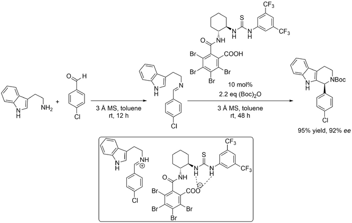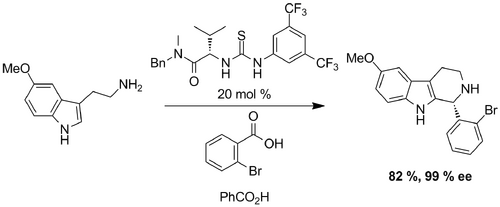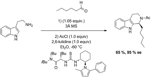 Under optimized conditions (-30 °C, ether, 5 mol% catalyst), Jacobsen's thiourea delivered enriched tetrahydro-B-carbolines in 65-81% yields, and up to 95% ee.