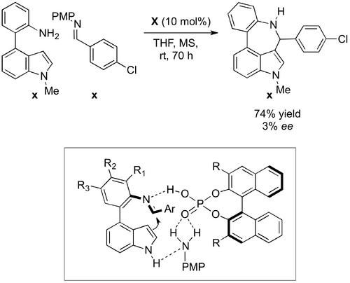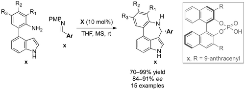 Chiral phosphoric acids have also been used in catalytic asymmetric PS-type reactions to give 7-membered indolo[3,4-cd][1]-benzapines x. Tian and co-workers reported the phosphoric acid catalysed reaction of 4-(2-aminoaryl)insoles x with para-methoxybenezene (PMB) protected aryl imines. X (Scheme X). The researchers screened a number of imine and aldehyde nucleophiles and found that: 1) PMB to be the optimum imine protecting group, 2) the reaction proceeded with higher ee at greater concentration and 3) PMB protected imines reacted with higher enantioselectivity than their corresponding aldehyde (90 compared to 83% ee).