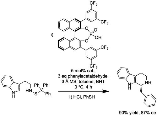 In 2007, Hiemstra reported the enantioselective synthesis of tetra-β-carbolines via the in situ formation of N-sulfenyliminium ions (10.1002/anie.200701808). Stabilization of the intermediate iminium by the N-tritylsulfenyl group was effective at promoting the acid-catalyzed PS reaction by substituted enantiopure binaphthyl-derived phosphoric acids. Several substitutions were assayed in the 2-position of the catalyst, with no clear trend being observed in the ee of product obtained. The N-S bond in the N-tritylsulfenyl product was found to be susceptible to homolytic cleavage, but this could be suppressed by the addition of a radical scavenger. A one-pot process was developed that allowed precipitation of the product as a salt, and this was applied to the synthesis of a variety of substituted tetra-β-carbolines with high yield and high ee. The reaction was also demonstrated on a multi-gram scale.