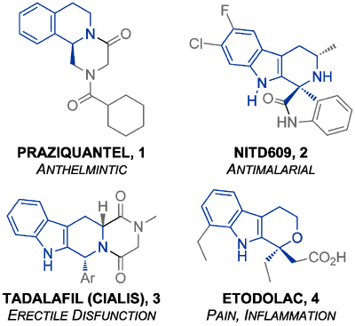 Several important pharmaceuticals may be synthesized with the PS reaction, for example the widely-used anthelmintic praziquantel, tadalafil (Cialis(TM)) used for erectile disfunction, the painkiller Etodolac and the promising new antimalarial compound NITD609 (Scheme Intro - Relevant Drugs). The biological activity of these compounds typically arises from one enantiomer: for example the (S) enantiomer of Etodolac (10.1021/jm00366a025) and the (R)- enantiomer of praziquantel (10.1371/journal.pntd.0000357); ent-NITD609 is inactive (10.1126/science.1193225). The potency of this class of compounds leads to great market value: $1.7 Bn for tadalafil alone in 2010.(Need: full reference inserting at end)(Eli Lilly Annual Report 2010, available at http://investor.lilly.com/annuals.cfm) Efficient enantioselective methods for the PS reaction would be very desirable, and progress to date in this field is the subject of this review. It is now certainly possible to carry out some PS reactions to give products with high enantiomeric excess. However, the scope of these processes is limited (as we shall see) reducing their impact on the preparation of bioactive compounds industrially. The PS reaction has been used in the racemic industrial synthesis of X, for example, but the enantiopure material is obtained through a resolution.(Need: example here - someone please check http://www.ncbi.nlm.nih.gov/pmc/articles/PMC3107522/)