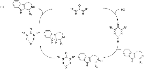 A proposed mechanism for the thiourea-catalysed enantioselective Pictet-Spengler-Type cyclization was published by Jacobsen in 2007. Interestingly, key experimental observations, supported by DFT computational analyses, pointed towards an SN1-type pathway in these cyclizations, with catalysis via a previously unprecedented anion-catalyst hydrogen bonding mechanism.