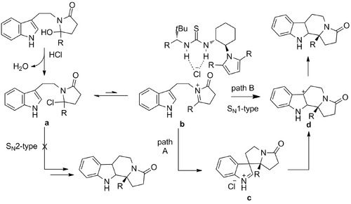Therefore, Jacobsen proposed that the thiourea catalyst promotes enantioselective cyclization by inducing dissociation of the chloride counterion and forming a chiral N-acyliminium chloride-thiourea complex. Noticeable halide counterion effects and solvent effects on enantioselectivity lend proof to this theory. Furthermore, it was suggested that catalysis and enantioinduction may result from initial abstraction of a chloride anion from a in an SN1-type rate determining step (a → b) and subsequent cyclization mediated by the resulting anion-bound thiourea. This mode of catalytic generation of cationic intermediates was previously reported in the well-established anion-binding properties of ureas and thioureas. Further, the possibility of high levels of enantioinduction induced through counterion interactions is well precedented in chiral phase-transfer catalysis and has recently been demonstrated in the context of asymmetric counterion-directed catalysis.
