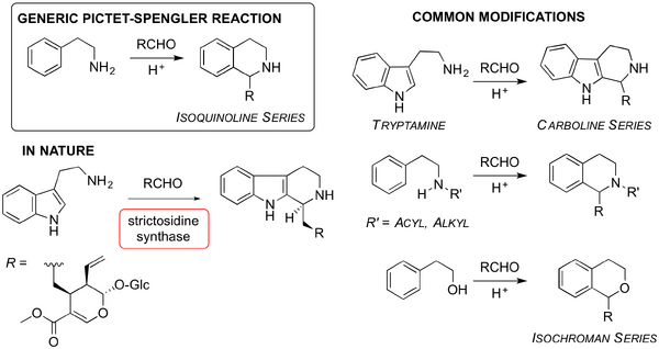 The Pictet-Spengler (PS) reaction is just over a century old.Pictet, Spengler 1911 The reaction is a cyclization between an amine that carries an aromatic ring, and an aldehyde, usually catalyzed by acid (Scheme 1911 Pictet Spengler 2). The original reaction employed formaldehyde and phenethylamine, to give the tetrahydroisoquinoline scaffold. Several years after the original report tryptamine was found to perform well in the reaction permitting access to a range of tetrahydrocarbolines.[Tatsui 1928] A wide range of variations on these original themes have been investigated,Stöckigt 2011, Whaley, Govindachari[Youn 2006][Larghi 2011] such as cases where the amine component is acylated or alkylated, those where ketones are employed rather than aldehydes so as to generate quaternary centres adjacent to the aromatic ring, and reactions employing alcohols rather than amines - the so-called oxo-PS reaction.