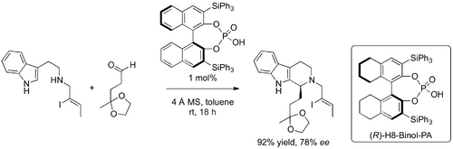 An (S)-BINOL-phosphoric acid was employed to catalyse an asymmetric oxa-Pictet-Spengler reaction as part of an iridium(III)-catalysed isomerisation/Brønsted acid catalysed Prins-type cyclisation sequence. It was suggested that the acid protonates the enol ether substrate to generate an oxocarbenium ion intermediate, which then forms an ion pair with the chiral conjugate base and undergoes an oxa-Pictet-Spengler reaction. Pyran-fused indoles were obtained in up to 75% yield with 60% ee. (A Tandem Isomerization/Prins strategy: Iridium(III)/Bronsted Acid Cooperative Catalysis, V. M. Lombardo, C. D. Thomas and K. A. Scheidt, Angew. Chem. Int. Ed. 2013, 52, 12910-12914. Paper)