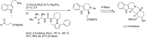 In 2008, Jacobsen put his previously discovered enantioselective thiourea-acyl-Pictet-Spengler catalyst to use in the total synthesis of (+)-yohimbine. The synthesis was achieved in 11 steps and 14% overall yield. The absolute configuration of the molecule was established through the highly enantioselective thiourea-catalyzed acyl-Pictet-Spengler reaction at the start of the synthesis.